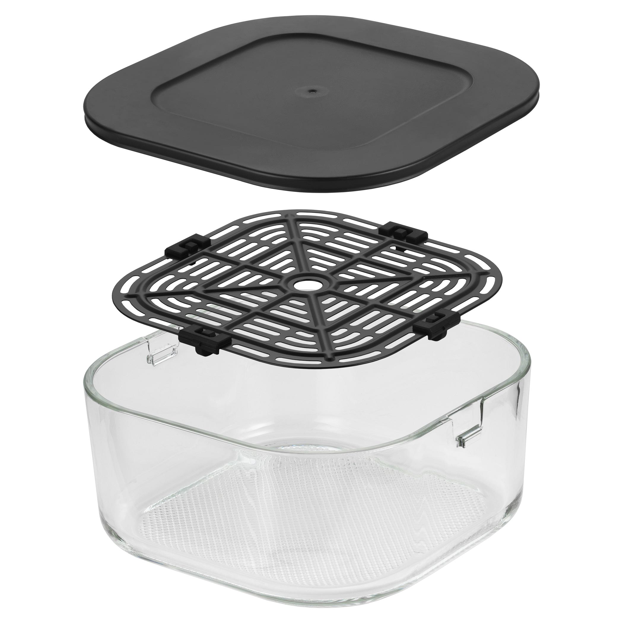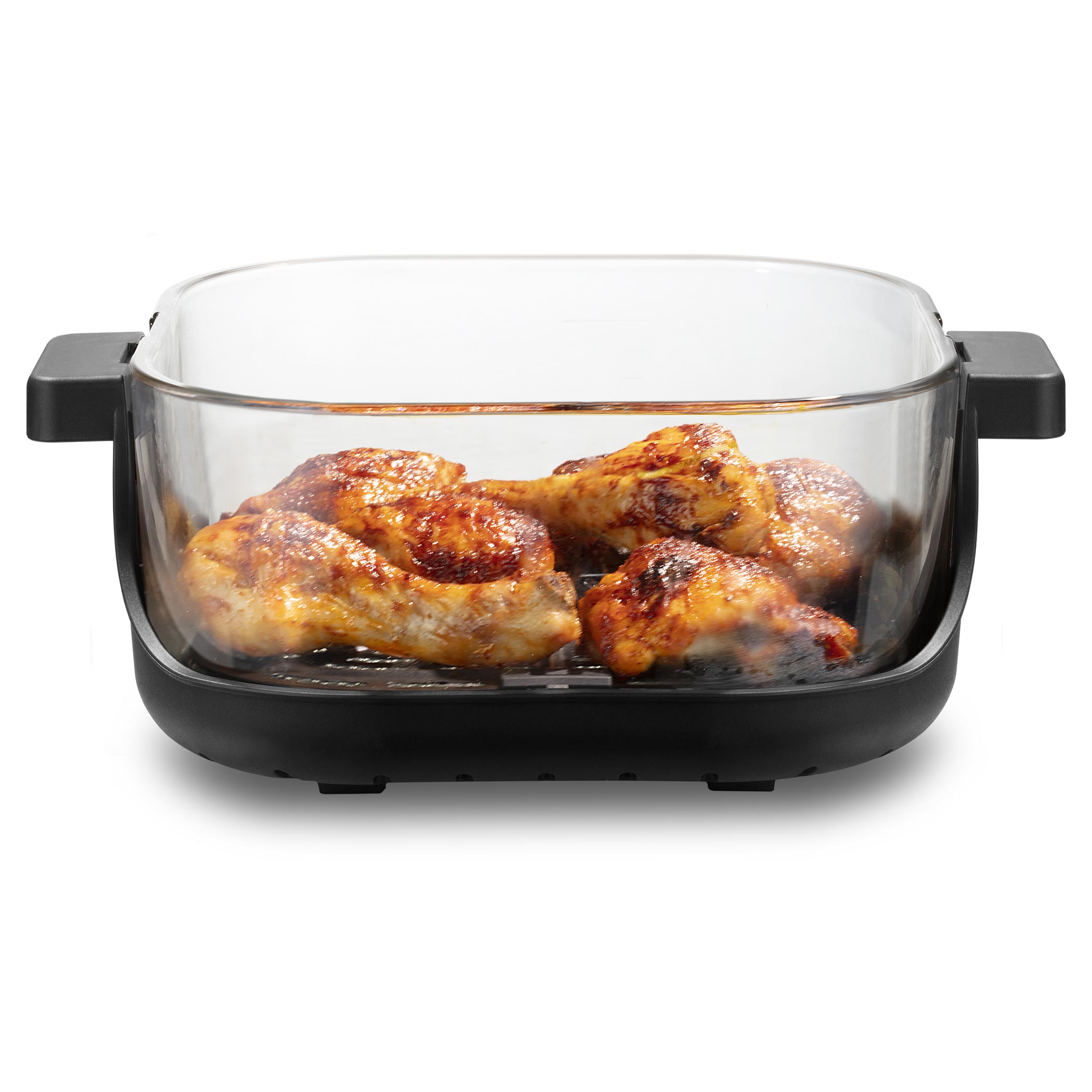 držák s uchy a hned po uvaření se dá rovnou použít jako skleněný pekáč na stůl, ze kterého můžete servírovat. Také má víčko, kterým ji uzavřete, a po vychladnutí uložíte do lednice nebo vezmete s sebou třeba do práce. Tato fritéza je navržena tak, že se celá ohřevná jednotka na jednotlivé nádoby přikládá shora, takový „tyčák styl“. Do nádoby dáte jídlo, na nádobu nasadíte ohřevnou jednotku, na dotykovém displeji nastavíte jeden ze