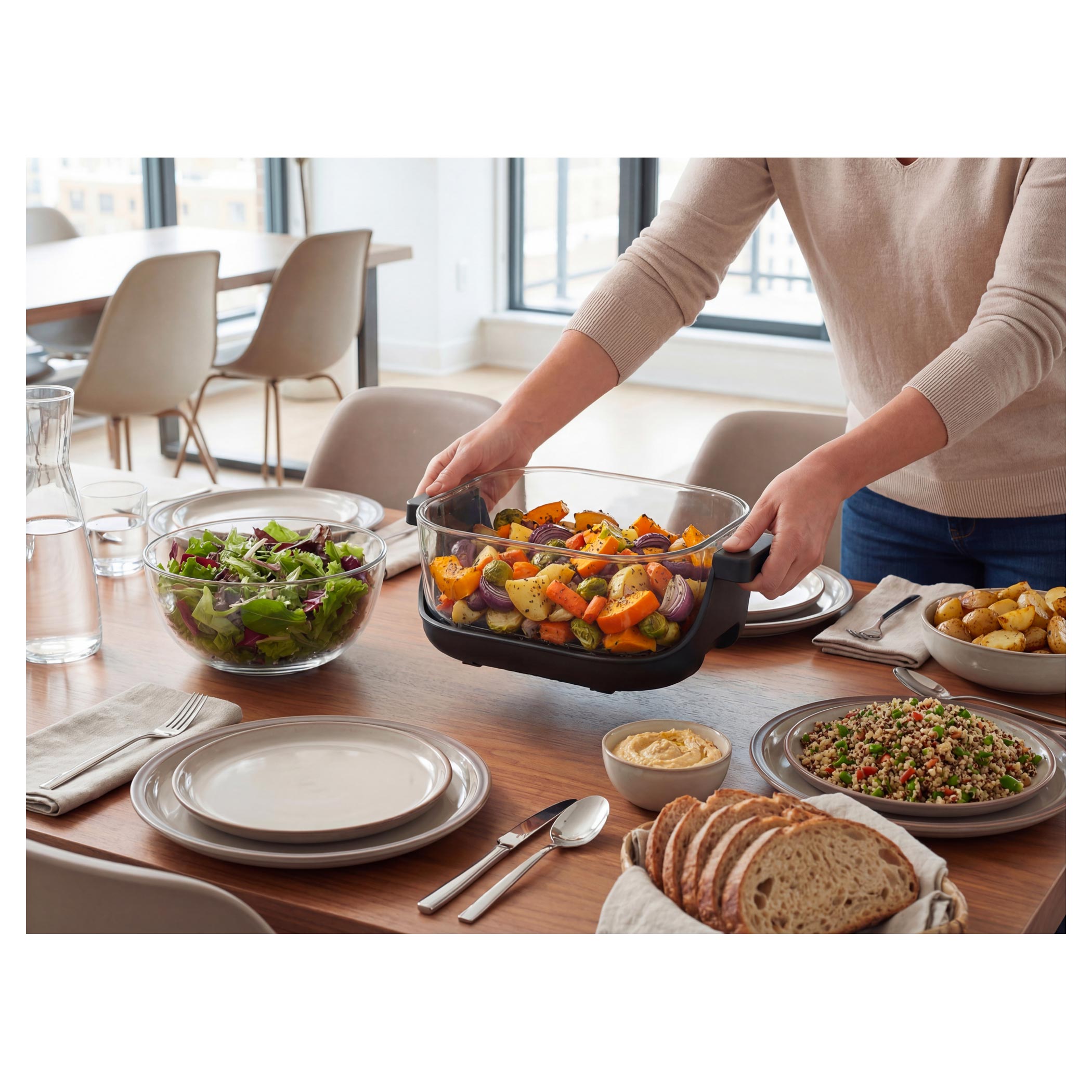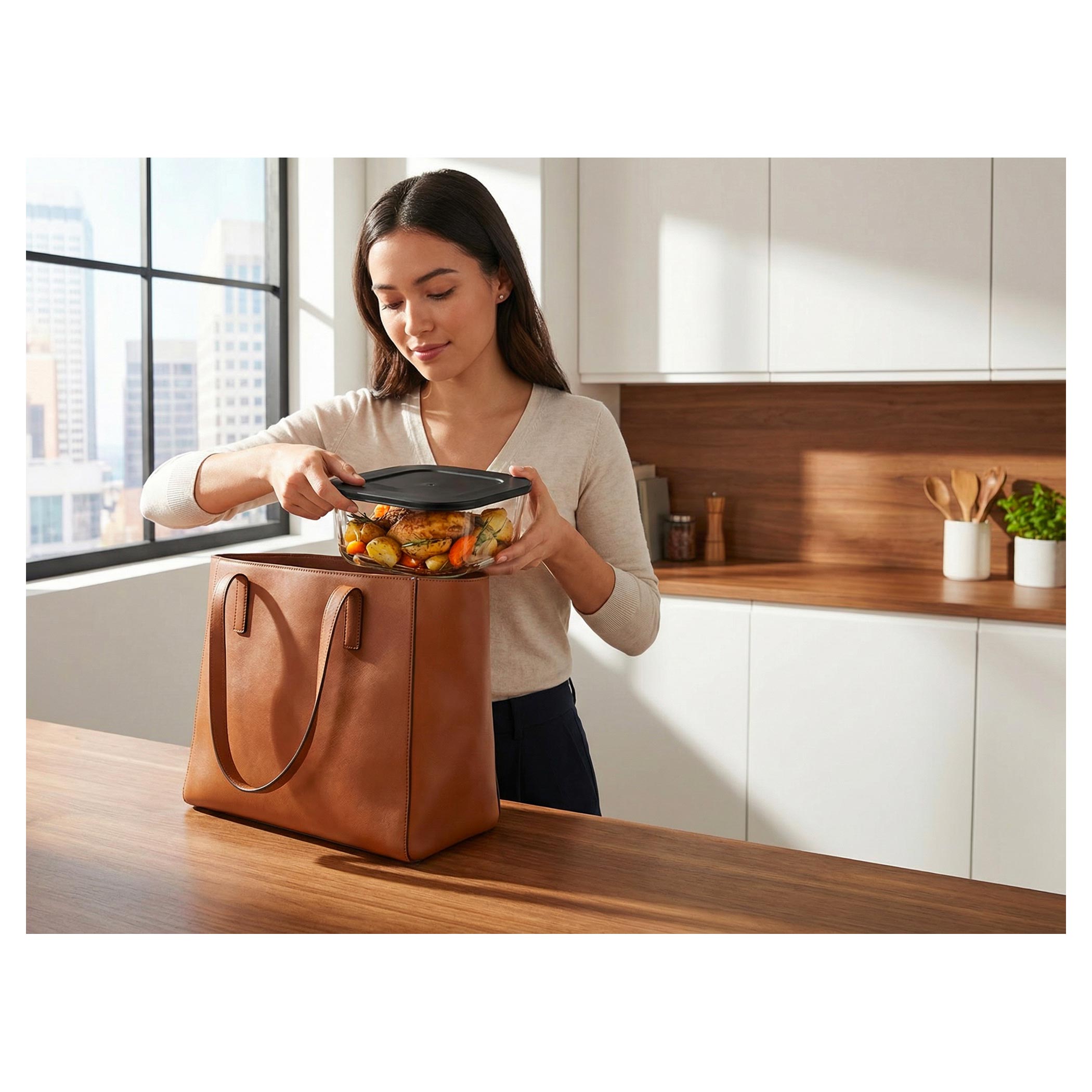 bezpečná pro každodenní používání a neabsorbuje pachy ani chutě. Navíc vidíte celý proces přípravy, což dává vaření větší jistotu i radost. Ohřevná jednotka se jednoduše nasadí shora na zvolenou nádobu, vaříte bez složité manipulace a po dokončení jen vezmete nádobu s uchy. Jídlo rovnou servírujete nebo uložíte do lednice. Unikátní