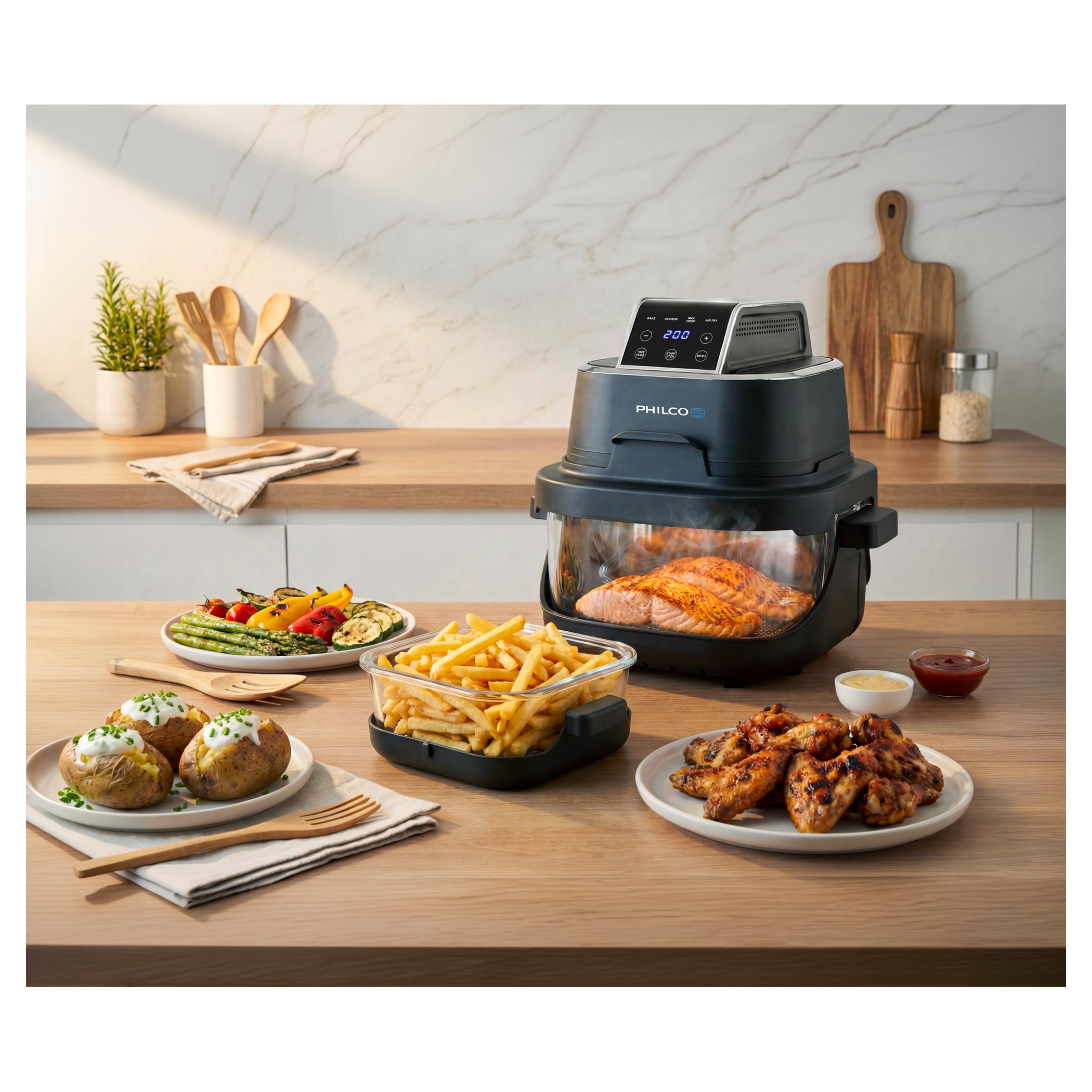Horkovzdušná fritéza Philco PHAF 2005 Fry&Go vás naučí vařit rychle, chytře a nevyhazovat zbytky. Rozšiřuje naši skleněnou řadu fritéz Glassio pro chytré, přehledné a udržitelné vaření. S